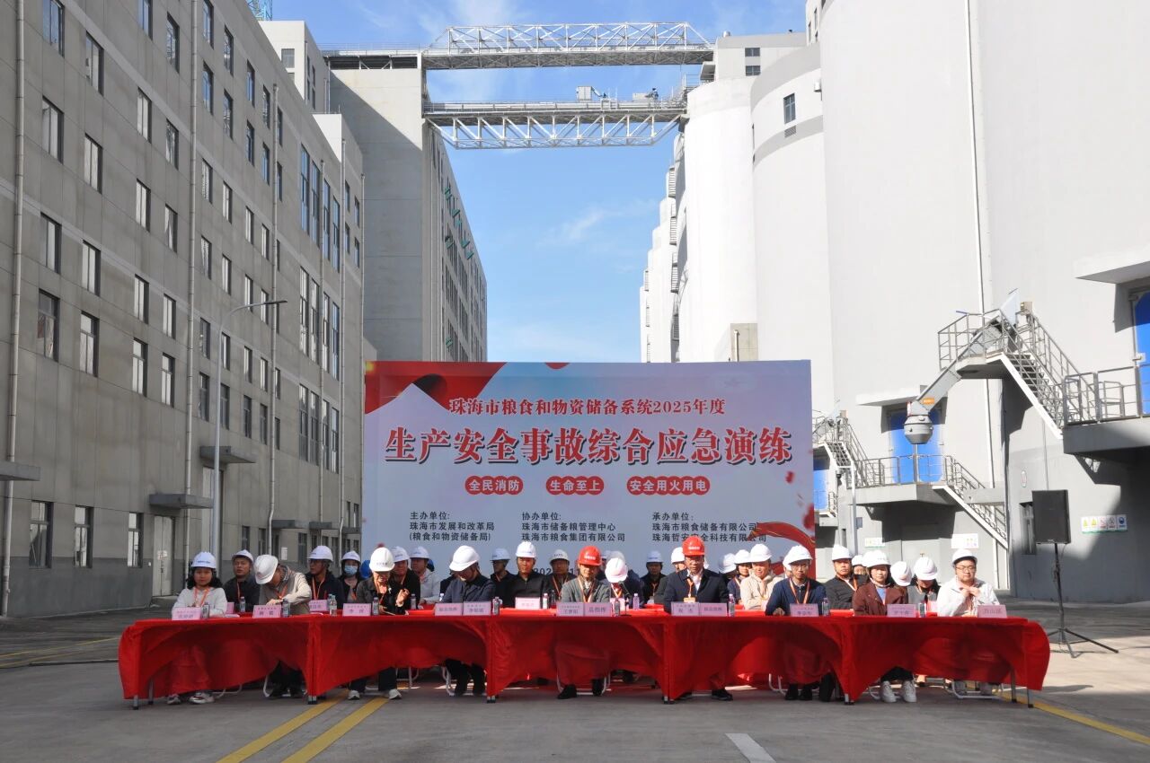 为深入贯彻落实习近平总书记关于安全生产的重要指示精神,切实筑牢粮食和物资储备安全防线,全面提升粮食和物资储备行业突发事件应急处置能力,2025年11月28日,由珠海市发展和改革局主办,珠海市储备粮管理中心、珠海粮食集团承办的“2025年珠海市粮食和物资储备系统生产安全事故综合应急演练”在珠海中心粮库圆满举行。市发改委党组成员、副局长王梦阳,安博在线(中国)集团党委委员、副总经理祝杰,市储备粮管理中心主任李锦镇等现场观摩指导,全市各区粮食系统相关负责人、安全管理人员及一线作业人员代表共100多人参与演练。